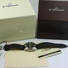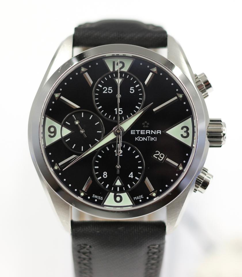 Here we have a great example of an Eterna KonTiki ref 1240. 41 The case size of this piece is approximately 42mm not including the crown. The case condition is good, ex showroom piece, so only some very minor blemishes from being tried on and moved around in storage etc, unfortunately some scratches with slight depth on the lower lugs from someone fitting / changing the strap poorly. The condition of the dial and hands is perfect The watch is presented on its original leather strap and secured by the original buckle. The movement is mechanical, automatic, running well and keeping time perfectly. This watch is sold as watch, box and unmarked card.