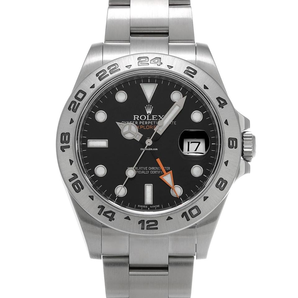 Control number] 645953 Genre Watch/Men’s Brand rolex Model] Explorer ii Model No. ] 216570 Serial No. ] g (manufactured around 2010) Movement] Automatic / Cal. 3187 Dial] Black Case] Stainless steel Sapphire crystal windshield Bezel] Stainless steel Bracelet] Oyster bracelet (stainless steel) Condition Pre-owned Rank a Case: Slightly scratched. Bezel: Slightly scratched. Belt: No noticeable damage Buckle: No noticeable damage Windshield: No noticeable damage Size Case  Height/approx. 42mm  Width/approx. 42mm  Thickness: approx. 12. 5mm Lug width/21mm Arm circumference: approx. 19. 5 cm [Functions Waterproof (100m) Chromalight luminescence Date display 2-time display Accessories Manufacturer’s warranty (purchased in Japan in October 2011) Manufacturer’s box Booklet Model Description. Ref. 216570 was introduced in 2011, replacing the previous Ref. 16570. While the basic design of the new Ref. 216570 follows that of its predecessor, the case diameter has been increased to 42 mm, and the larger diameter dial features enlarged indexes and hands, which greatly improves legibility. The movement has also been updated to Cal. 3187 with Paraflex shock absorber. [Comment.