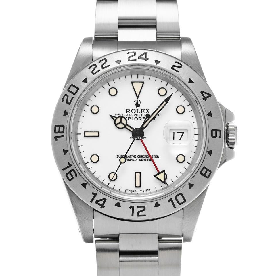 Control number] 658323 Genre Watch/Men’s Brand rolex Model] Explorer ii Model No. ] 16570 Serial No. ] s (manufactured around 1994) Movement] Automatic / Cal. 3185 Dial] White Case] Stainless steel Sapphire crystal windshield Bezel] Stainless steel Bracelet] Oyster bracelet (stainless steel) Condition Preowned Rank a Case: a few minor scratches, a few strikes. Bezel: A few minor scratches can be seen. Belt: a few minor scratches Buckle: A few minor scratches can be seen. Windshield: No noticeable damage Size Case  Height/approx. 40mm  Width/approx. 40mm  Thickness: approx. 12mm Lug width/20mm Arm circumference: approx. 18. 5 cm [Functions Waterproof(100m) Tritium luminescence Date display 2 time display Accessories Manufacturer’s warranty card (purchased in Japan in August 1994) Manufacturer’s box (damaged) Tag Model Description. Developed for people who work in places where it is impossible to keep track of time according to the position of the sun, such as in caves or in polar regions, the Explorer ii is structured around a 24-hour display of the time. Equipped with Cal. 3185, a movement capable of independent correction of the short hand, it is also possible to display dual time using the 24-hour hand and the short hand. In 2007, the movement was replaced by the Cal. 3186 with improved single correction of the short hand and a Parachrom balance spring, which was produced until 2011. Comment. This is a good example with a white dial that appears slightly bluish, which is unique to the period, and a good atmosphere with matching lightly aged tritium luminous paint. The bracelet is Ref. 78790 with a clasp with safety catch, ff is 501B, and the clasp code is x (manufactured around 1999).