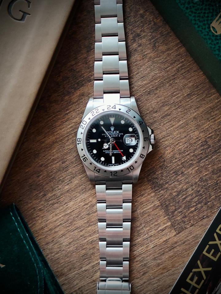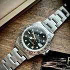 This iconic timepiece, which was originaly introduced in 1989, is renowned for its robust design and practical features. Originally created for adventurers, it includes a 24-hour hand and fixed bezel, perfect for distinguishing day from night in extreme environments. The watch features a durable stainless steel case and bracelet, a black dial with luminous markers, and a date window with the signature Cyclops lens. Powered by the reliable Rolex caliber 3185 automatic movement, it offers precision and reliability. This 40mm Rolex Explorer II 16570 combines elegance with functionality, making it ideal for any occasion. Own a piece of horological history that embodies exploration and resilience. The watch comes without a box or papers, but it does include a Rolex pouch. Contact me for more details or additional photos or information.