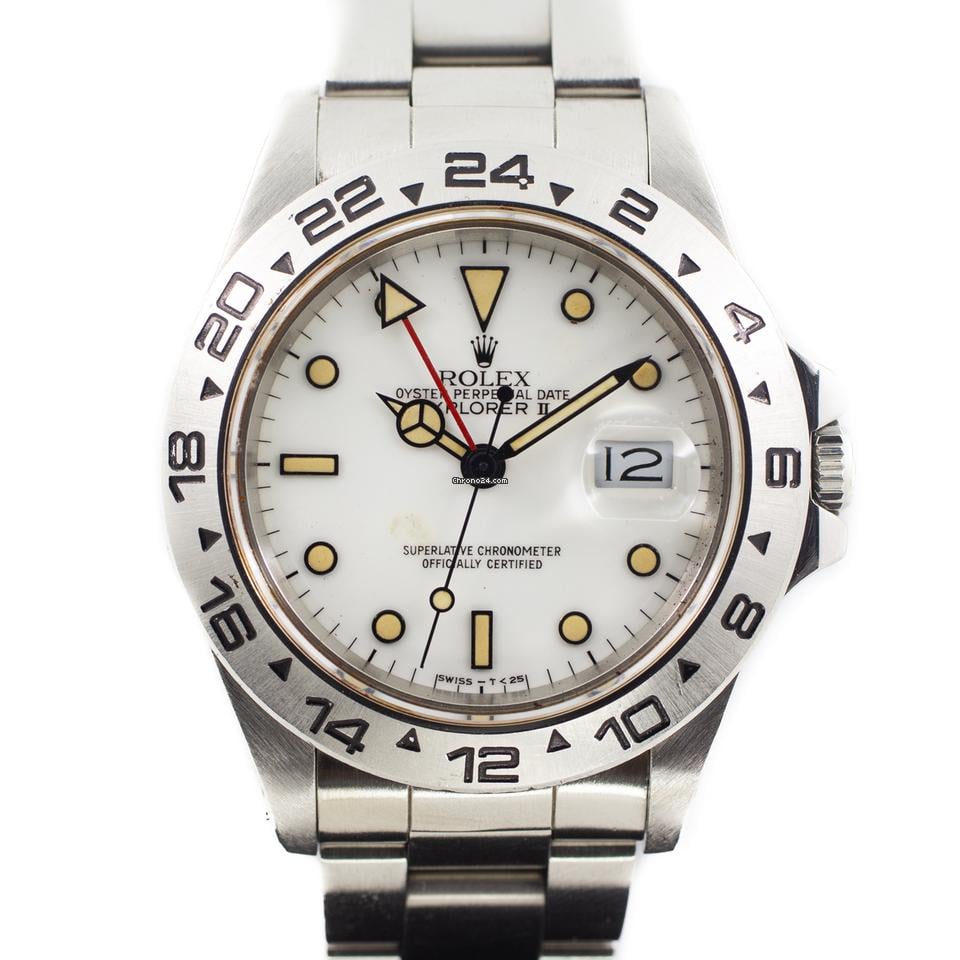 SKU: I0513516 Model: Rolex Explorer II ‘Polar’ Reference: 16550 Condition: Fair Comes With: Watch only Originally Purchased Date: R Series, Circa 1987 Material: Stainless Steel Case Dimension: 40mm Case Back: Solid Caseback Bezel: Stainless Steel Crown Material: Stainless Steel Crystal Material: Sapphire Crystal Dial: White Bracelet / Strap: Original Steel Bracelet Clasp Type: Original Steel Folding Clasp Movement Type: Automatic Functions: Hours, Minutes, Seconds, Date, GMT Additional Information: Blemish on the watch dial