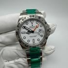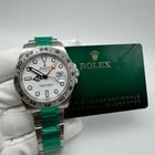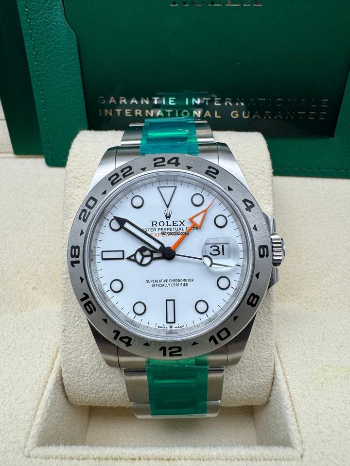 The Rolex Explorer II 22657 often referred to as the Polar is a legendary timepiece that’s as robust as it is stylish. With its striking white dial and luminous markers it’s designed for adventurers who thrive in challenging environments. The bold contrast between the white dial and the black 24-hour bezel is both functional and eye-catching ensuring excellent readability in any conditions.