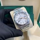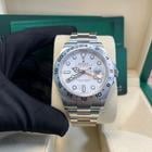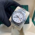 42mm Oystersteel case, screw-down back, screw-down crown with twinlock double waterproofness system, fixed bezel with 24-hour graduations, scratch-resistant sapphire crystal with cyclops lens over the date, white dial, hour markers set with blue Chromalight, Rolex calibre 3285 self-winding movement with second time-zone hour hand and instantaneous date, approximately 70 hours of power reserve, Oyster bracelet with flat three-piece links, folding Oysterlock buckle with Easylink 5mm comfort extension link. Waterproof to 100 meters.