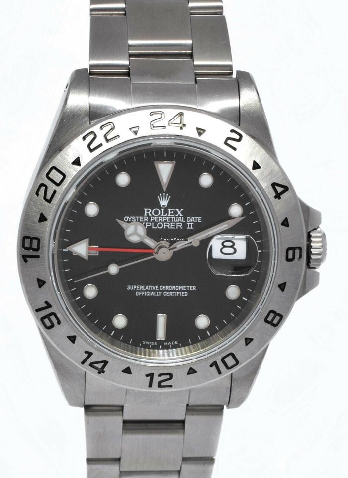 Mint preowned mens Rolex Explorer II (ref. 16570 ; D-serial number approx 2005- ) in stainless steel features a black dial with date and red GMT hand. Comes on Rolex Oyster bracelet with deployant buckle. Fits up to 7. 5 inch wrist. Box and Papers Included. (papers dated 2007)We are a family owned brick and mortar Jewelry Store specializing in fine new and pre-owned jewelry and watches. Each of our pre-owned watches is fully checked, serviced, and detailed. All items guaranteed authentic.