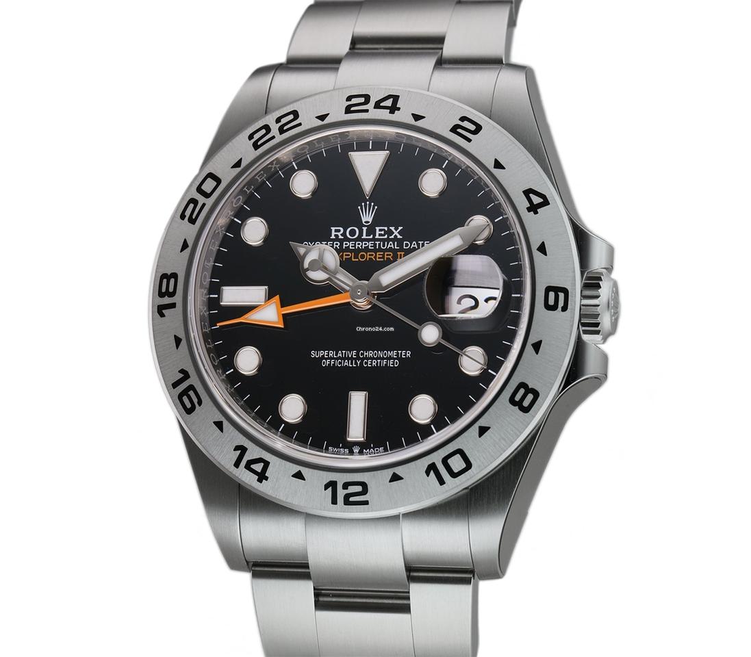 This Explorer II 226570 is new un-worn with original box and papers. MSRP: $9,750 USD Case is made of stainless steel with brush-finished lugs and high-polish finished sides. The 24-hour bezel mounted atop is brush-finished stainless steel. Both crown and solid case back are screw-down. The oyster bracelet is stainless steel as well, mostly brush-finished with the exception of the sides of the links. Functions are displayed on a black dial that is accompanied by blue luminescent filled hands and luminous hour markers. Featured on the dial: – Large central sweeping seconds hand. – Magnified date window at 3 o’clock. – Large central orange GMT hand.