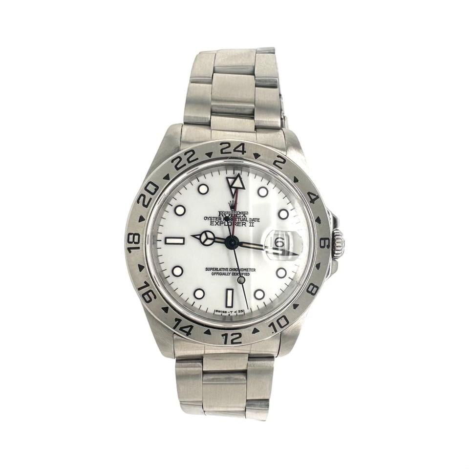Brand: Rolex Model Name: Explorer II Model Number: 16570 Movement: Mechanical Automatic Case Size: 40 mm Case Material: Stainless Steel Bracelet: Stainless Steel, Oyster Dial: Polar white with Dot and Index Luminescent Hour Markers Bezel: Fixed GMT Bezel Links: 11 Links Year: 1991 Includes: 24 Months Warranty From Our Company No Box, No papers The Rolex Explorer II reference 16570 is a distinguished timepiece renowned for its timeless elegance and robust functionality. With a 40mm stainless steel case and a striking polar white dial adorned with luminescent dot and index hour markers, this watch effortlessly combines style and readability. Its sturdy Oyster bracelet, featuring 11 links, ensures both comfort and durability, making it the perfect companion for explorers and watch enthusiasts alike.