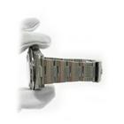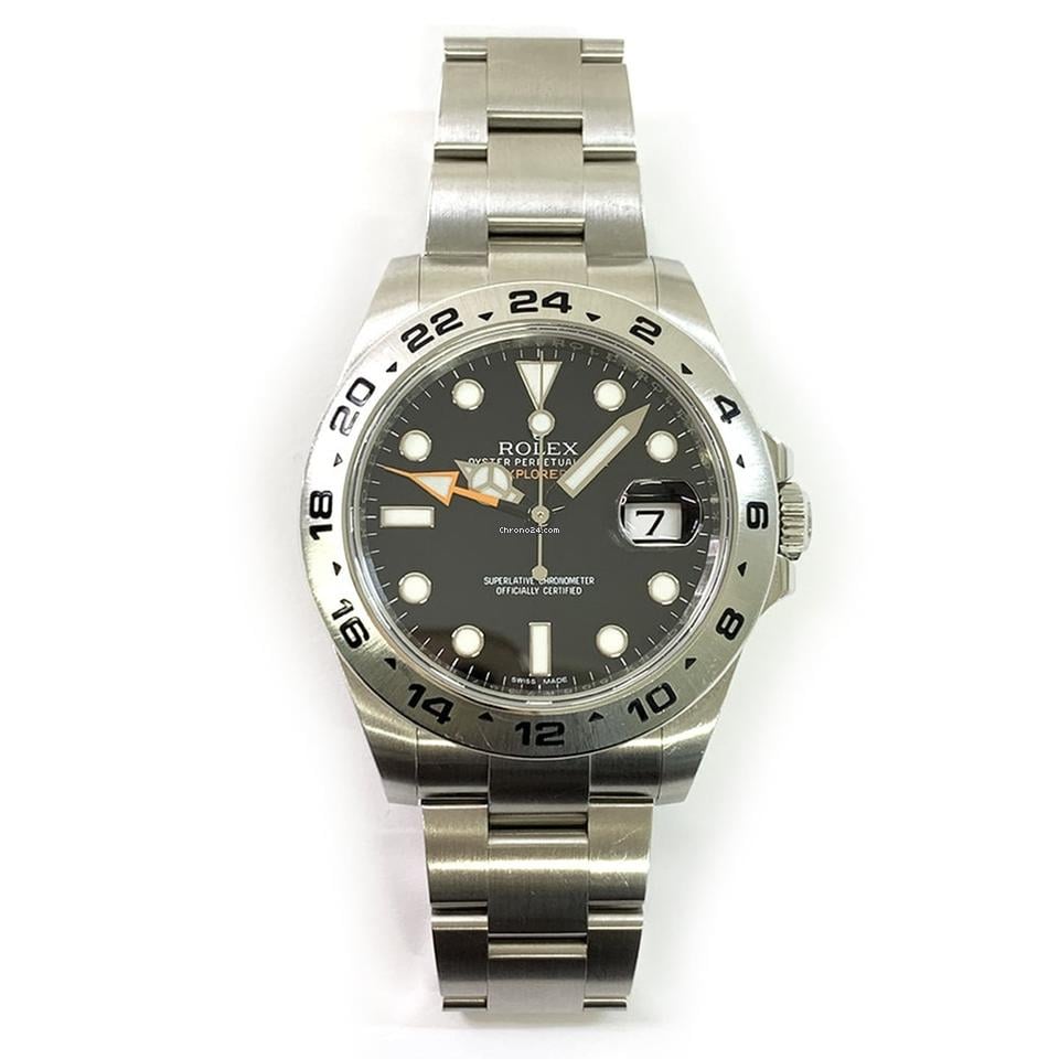 Stainless steel case with a stainless steel Rolex oyster bracelet. Fixed stainless steel bezel showing 24 hour markers. Black dial with luminous silver-tone Mercedes-logo, sword, and Breguet-style shape hands and dot hour markers. Minute markers around the outer rim. Dial Type: Analog. Luminescent hands and markers. Date display at the 3 o’clock position. Rolex calibre 3187 automatic movement with a 50-hour power reserve. Scratch resistant sapphire crystal. Screw down crown. Solid case back. Round case shape. Case size: 42 mm. Band width: 20 mm. Oysterlock clasp. Water resistant at 100 meters / 330 feet. Functions: GMT, second time zone, date, hour, minute, second, chronometer. Luxury watch style.