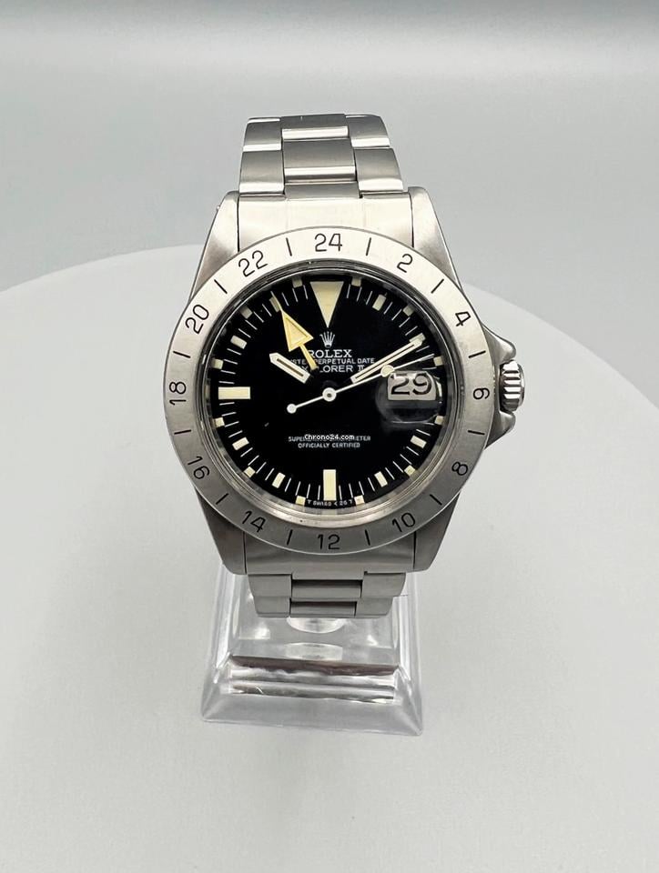 This is a very fine Rolex Explorer II, a model appeared in Rolex catalogs in 1971 as the reference 1655. This watch is extremely clean with a perfect dial, strong case and lugs, and a full length bracelet. This watch comes with box, hang tag, papers and a service receipt from Rolex. Instead of a refined upgrade of the Explorer, the Explorer II is a completely unique watch of its own. Featuring a 24-Hour calibrated bezel, the purpose was to provide miners to differentiate between night and day in tremendous caving expeditions. Whilst referred by collectors as “freccione” which translates to “big arrow”, indicating the oversized and neon-like orange center hand, a feature intended to further facilitate the reading of the 24-hour cycle in low light conditions (such as can be found, indeed, in caves). The reference 1655 was produced in five different variations (marks) and with two known additional service dials (one with tritium and the other with luminova). The present example is fitted with a Mark I dial with < 25 T designation on the dial. .
