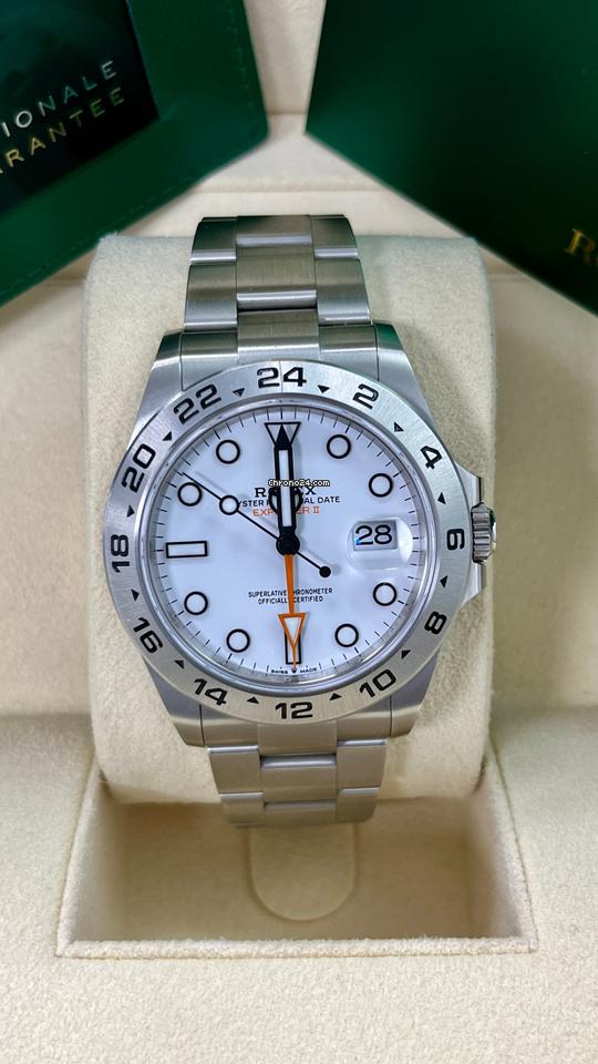 Rolex Explorer II 226570 White Dial (2024) – Like New with Box & Papers For sale is a brand-new 2024 Rolex Explorer II, reference 226570, featuring a clean and striking white Polar dial with black surrounds on the hour markers and hands for maximum legibility. This iconic timepiece is housed in a robust 42mm stainless steel case and is designed for adventure, offering a dual time zone function with its distinctive orange 24-hour hand. Key Features: Model: Rolex Explorer II 226570 Year: 2024 Dial: White Polar with Chromalight display for excellent visibility Bezel: Fixed stainless steel with 24-hour scale Case Size: 42mm Material: Stainless Steel (Oystersteel) Bracelet: Oyster bracelet with Oysterlock clasp and Easylink extension Movement: Rolex Caliber 3285, automatic, with approximately 70-hour power reserve Functions: Hours, minutes, seconds, date, and dual time zone with 24-hour hand Water Resistance: 100 meters (330 feet) Condition: Brand new, unworn Includes: Original Rolex box Papers The Rolex Explorer II 226570 is the ultimate companion for adventurers, offering robust performance, timeless design, and exceptional functionality. Its versatile and durable design makes it perfect for both professional use and everyday wear. This brand-new 2024 model comes in pristine condition with its original box and papers, making it a must-have for collectors and enthusiasts alike.