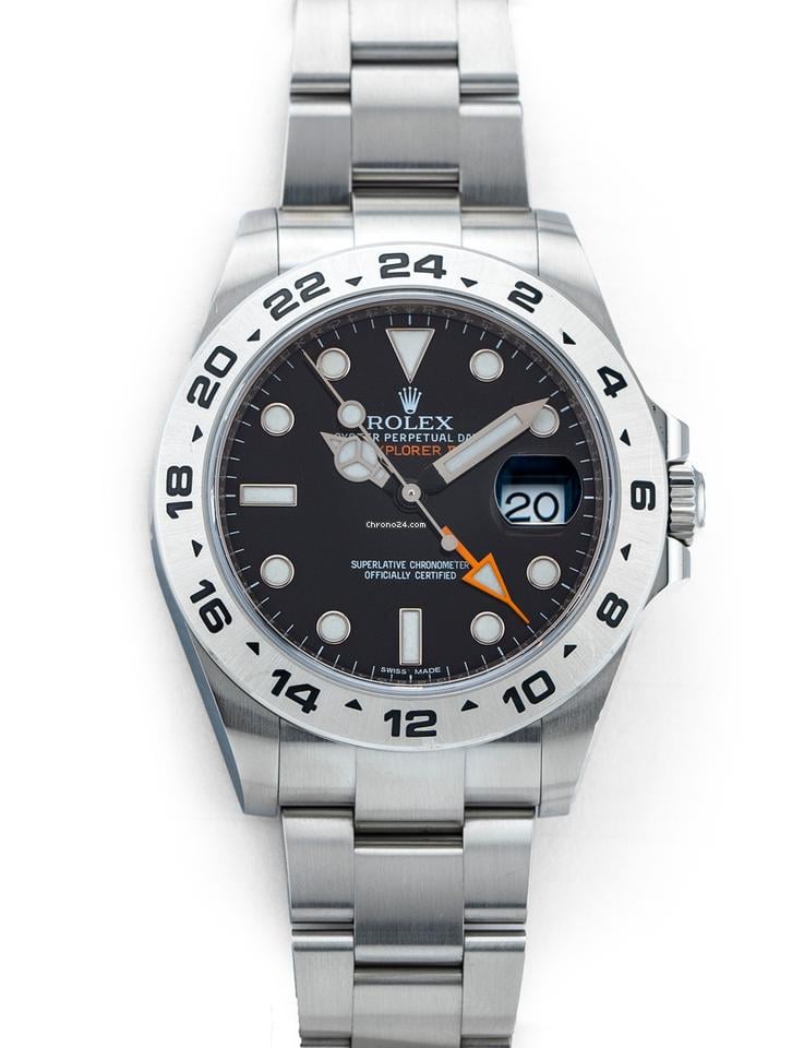 Rolex Explorer II ‘Big Orange’ Steve McQueen 42mm Stainless Steel – Reference 216570 BKSO (Black Dial) Pre-Owned; Purchased new from Rolex Dealer in February 2021 per included Rolex Warranty Card. Condition: lightly and carefully worn with only slightest visible signs of careful and occassional wear over the years. All pictures are of actual watch you will receive. 100% Complete with everything as purchased new from dealer: Original Rolex oversized double box set Original Rolex plastic Warranty Card, Serialized Hang Tag Original Rolex Instruction book, Rolex Warranty/Service Booklet, leather Rolex wallet/card holder, Everything as pictured and as purchased new from dealer! Original Rolex Stainless steel Oyster bracelet is full length, complete with all links as purchased new direct from dealer and will fit up to 8 inch wrist size. Additional Details: 42mm Stainless Steel Case with fixed GMT 24-hour bezel and solid caseback Automatic Movement with Date Indication and GMT hand (used 24 hours markers on bezel to indicate second time zone) black dial with ultra-luminous (lights up like a flashlight at night) hour/minute hands and indices, ‘Big Orange’ GMT arrow hand Our team of professional watchmakers have carefully inspected this watch and confirmed that it is keeping spot-on accurate time, well within manufacturer standards. We warranty this watch for 12-months from date of purchase. Total Transparency is our #1 Brand Value. We guarantee: This Watch is in our hands and available for immediate overnight delivery. This is the watch you will receive; We ONLY have 1 and this is it! When its gone, its gone for good! All pictures are of actual watch and contents taken date of auction posting. We never use stock photos for our watch listings. What You See Is (EXACTLY) What You Will Receive. Call OJ by 4pm TODAY and have this watch on your wrist in time for lunch TOMORROW (no exaggeration, no BS, try us!) We are open to taking trades for this watch; Please contact us and send of us pictures of any watches you might want to trade towards this watch.