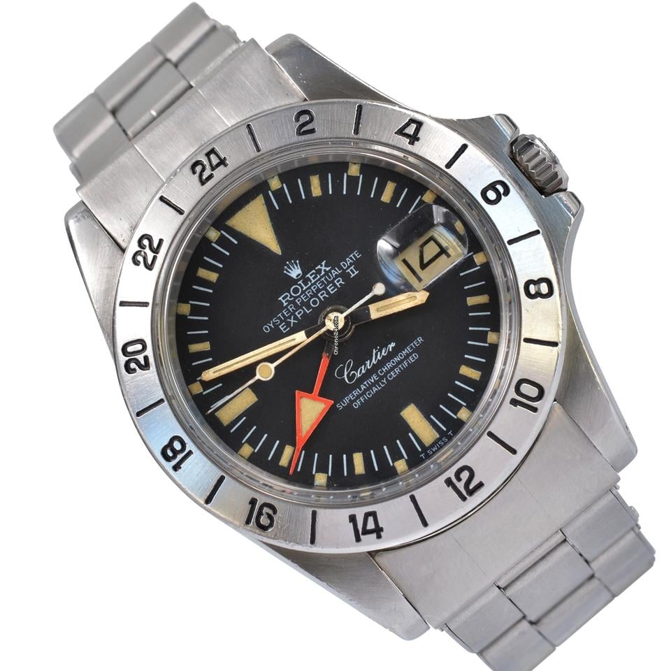 Brand: ROLEX Model: Explorer II 1655 Freccione MK2 Steve McQueen for Cartier 1974’s Reference: 1655 Number serial case: 374XXXX Number serial Movement: D56XXXX Year of production: 1974 Case / Dimensions: Steel / 40 MM excluding winding crown Case thickness: 13 MM including plastic glass Case back: Oyster 1655 steel waterproof screw closure Water resistance: 50MT / 5 ATM Bezel: MK2 satin steel with GMT function original Rolex of the epoch Glass: Plastic domed Tropic 116 with Cyclops lens Dial: MK2 by Cartier matt black colour with date indexes and hands to tritium Movement: Automatic winding mechanical caliber 1570 – 26…