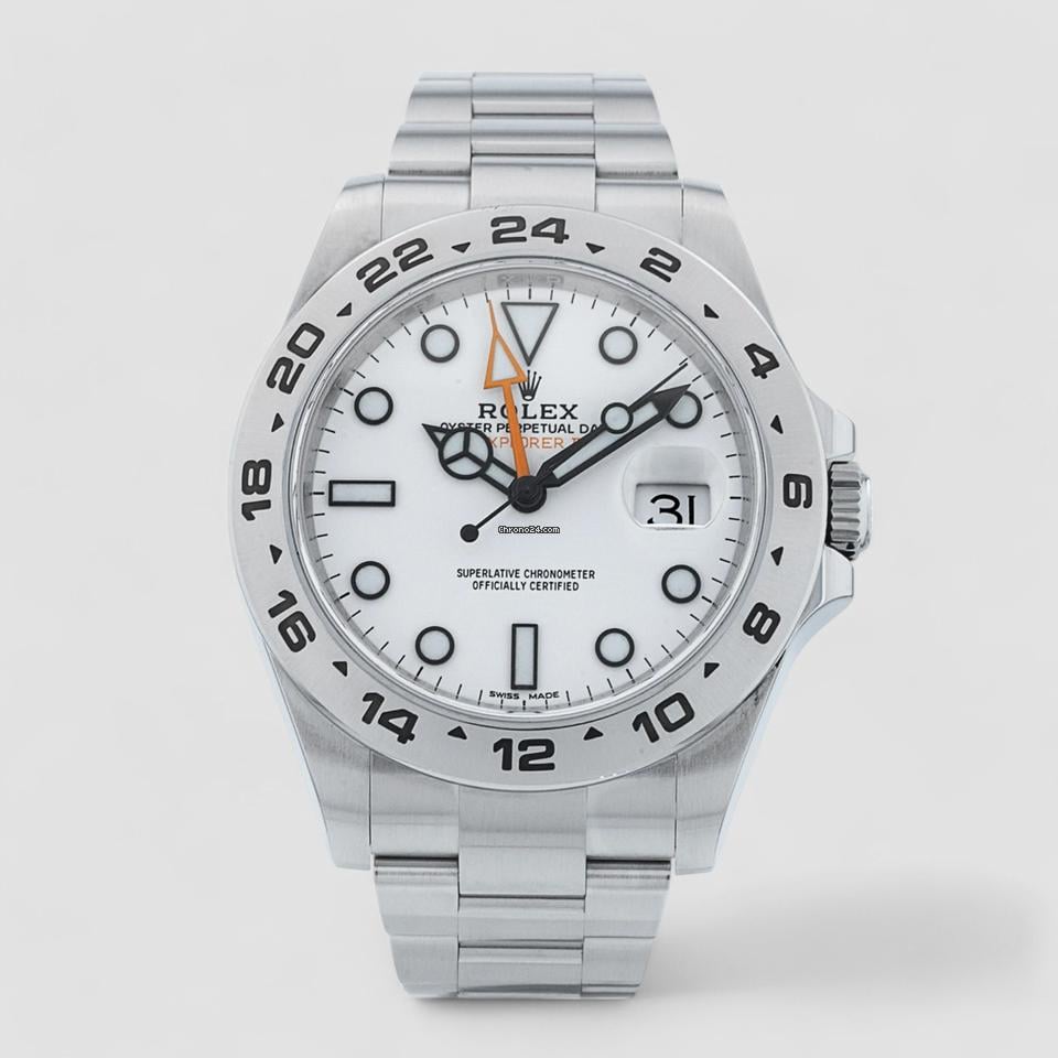 The original Explorer will forever be associated with the successful Everest ascent of 1953 when members of the expedition wore early versions of the model. Then came the more advanced Explorer II— the now-legendary reference 1655 launched in 1971—which was a tool watch specifically aimed at cavers. It featured an extra hour hand, orange and shaped like an arrow, which read against the fixed 24-hour bezel so that those in the dark could tell whether it was, for example, 9 o’clock in the evening or 9 o’clock at night. It can also be used as a GMT. This model, now discontinued and replaced with the reference 226570, is also a dual-timer, and retains similar looks to the 1970s original, albeit larger at 42mm. It’s the ultimate adventurer’s watch, iconic, handsome and robust. This Rolex Explorer II 216570 has a white dial and a bracelet strap. This Rolex has undergone a thorough inspection of water resistance, accuracy, functionality and condition to determine the level of reconditioning required to meet our strict standards. It has also been referenced against technical documents and manufacturer records where available to ensure authenticity and a clean history. All our watches have a 24-month warranty for your peace of mind. One of our skilled polishing technicians has removed marks on the case and bracelet of this watch, brought about by daily wear and tear, which is why this watch does not come with the remaining manufacturer’s warranty.