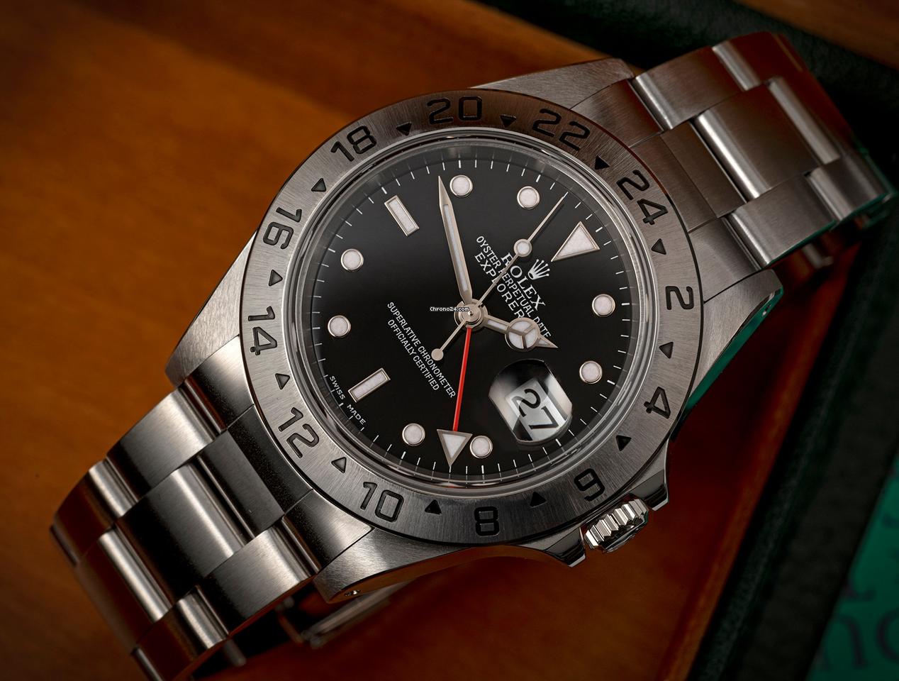 This 40mm stainless steel Explorer II had a full service at Rolex UK in 2023 and even retains its original green Rolex 16570 caseback sticker evidence of how sparingly it has been worn.
