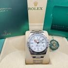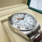 This brand-new, unworn Rolex Explorer II Ref. 226570 is a robust and iconic tool watch, known for its rugged design and exceptional functionality. Crafted from stainless steel, it features the highly sought-after white dial, also known as the Polar dial, offering maximum legibility and a clean, sporty aesthetic. Equipped with a 24-hour fixed bezel and an additional orange GMT hand, this Explorer II is perfect for adventurers and travelers alike. The watch comes as a full set, including the original Rolex box, booklets, warranty card holder, and Rolex guarantee card. It is covered by a 5-year international Rolex warranty. Key Features: Model: Rolex Explorer II Ref. 226570 Condition: Brand new, unworn Material: Stainless steel Dial: White ( Polar ) Bezel: Fixed 24-hour stainless steel bezel Movement: Automatic, dual time zone (GMT function) Bracelet: Oyster International warranty: 5 years remaining Full set: Includes box, papers, warranty card, and Rolex tag A modern take on a legendary adventurer’s watch—rugged, functional, and effortlessly stylish.