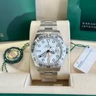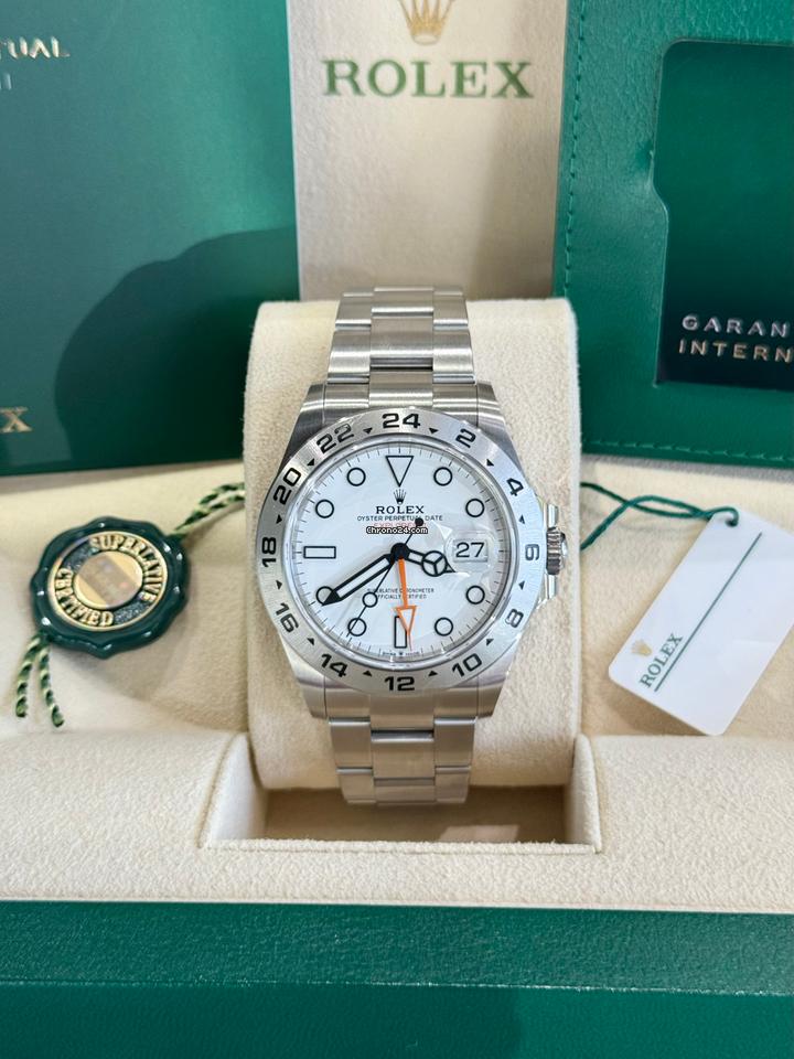 Rolex Explorer II Reference: 226570 Year: 2022 Movement: Officially certified chronometer self-winding movement with quickset date Jewels: 31 Caliber: 3285 Case: Stainless steel 42mm in diameter. Rolex logo on crown Bezel: Fixed stainless steel bezel with 24-hour graduation. Inner engraved Rolex bezel ring Crystal: Scratch resistant sapphire crystal with Cyclops lens Dial: White dial with luminous inlay hands and hour markers. Date calendar at 3 o’clock aperture. Bracelet: Stainless steel Oyster bracelet with Oysterlock clasp with Easylink 5mm comfort extension Condition: Mint Box & Papers: Original Rolex box, papers, and hangtag Working condition: Tested and timed on timegrapher. Keeping accurate time. Authenticity: 100% authentic