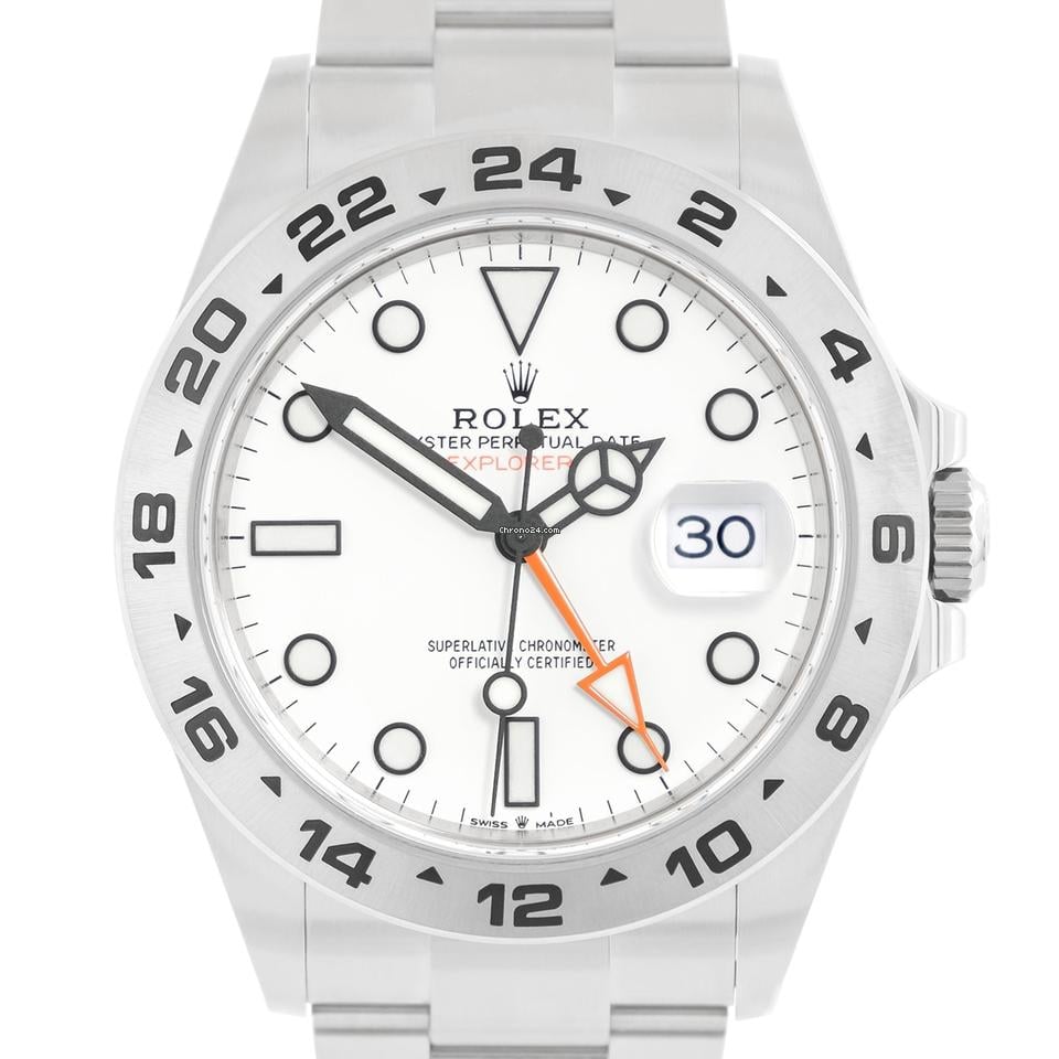 A Rolex Explorer II ref. 226570. This watch features a 42mm stainless steel case with a 24-hour brushed steel bezel and a white dial with the orange 24-hour hand. The watch is fitted with an Oyster bracelet in stainless steel complete with an Oysterlock clasp and a clever comfort extension link.