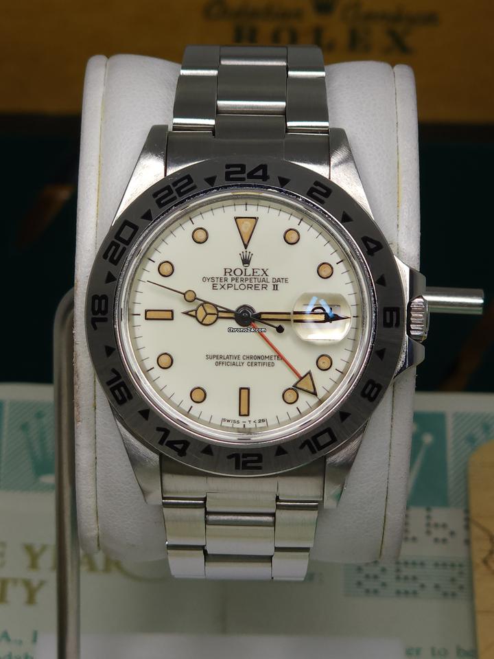 On offer is an extremely collectable Rolex reference 16550 Panna or ivory tropical dial. Serial number is 85xxxxx circa 1983. No two 2 Panna dials will ever be the same so you know you are buying something that is unique to yourself. 100% original untouched, unmolested black surround markers Panna/ivory “tropical” Explorer 2 dial with matching tropical markers and hands. 78360 bracelet with period correct “H” clasp code which dates to 1983. Bracelet condition is still in excellent condition with only slight stretch. 501 end links is correct to this reference. Bezel is period correct to this 16550 model and is in near mint condition with no paint loss whatsoever. Complete set with Your Rolex Oyster booklet, green translation booklet, leather folder, calendar, green price tag, chronometer tag, service booklet, RSC service guarantee dated Nov 2022, original Rolex guarantee purchased from USA.