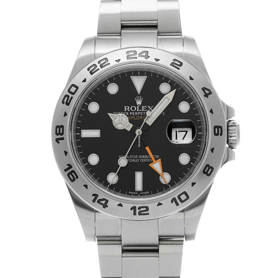 Control number] 644797 Genre Watch/Men’s Brand rolex Model] Explorer ii Model No. ] 216570 Serial No. ] g (manufactured around 2010) Movement] Automatic / Cal. 3187 Dial] Black Case] Stainless steel Sapphire crystal windshield Bezel] Stainless steel Bracelet] Oyster bracelet (stainless steel) Condition Used, Rank A Case: Slightly scratched. Bezel: No noticeable damage. Belt: Slightly scratched. Buckle: There are some minor scratches. Windshield: No noticeable damage Size Case Height/approx. 42mm Width/approx. 42mm Thickness: approx. 12. 5mm Lug width/21mm Arm circumference: approx. 20 cm [FUNCTIONS] [FEATURES Waterproof (100m) Chromalight luminescence Date display 2-time display Accessories Manufacturer’s warranty (purchased in Japan in January 2013) Manufacturer’s box Booklet Model Description. Ref. 216570 was introduced in 2011, replacing the previous Ref. 16570. Although the basic design of the new Ref. 216570 follows that of its predecessor, the case diameter has been increased to 42 mm, and the larger diameter dial features enlarged indexes and hands, which greatly improves legibility. The movement has also been updated to Cal. 3187 with Paraflex shock absorber. Comments. Overhauled in December 2024 at our own workshop