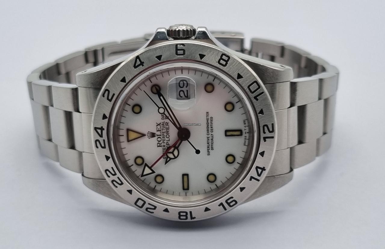 Rolex Explorer II White Dial Oyster bracelet N Serial 1992. Reference Number: 16570 Case Diameter: 40 mm Case: Oystersteel (stainless steel) Dial Color: White with hour markers relumed as pics. Bezel: Fixed stainless steel with 24-hour markings Crystal: Scratch-resistant sapphire crystal Water Resistance: 100 meters (330 feet) Movement: Rolex Caliber 3185 (Automatic) Power Reserve: Approximately 48 hours Bracelet: Oystersteel Oyster bracelet 78360 ends 501B with Oysterlock clasp and Easylink extension system and have n. 13 links Special Features: 24-hour dial, date function, rugged design, and chronometer-certified movement No box no paper – 1992 year serial N .