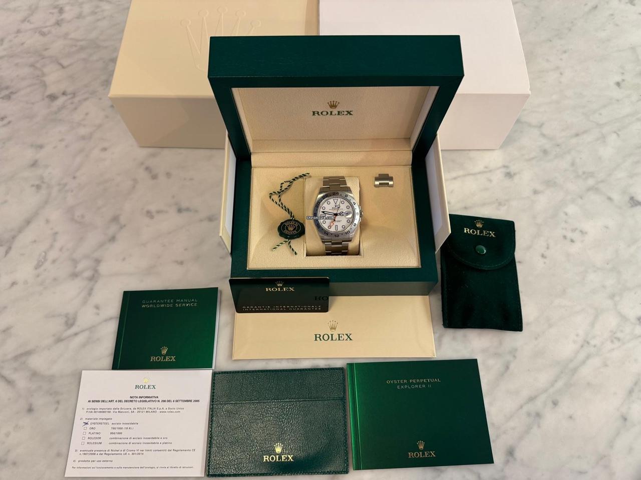 Single owner, reference 226570 polar full full set with all links , warranty card dated April 2023 (exp. April 2028) leather wallet, papers, box and outer box and Rolex travel pouch. I also sell with a copy of my original purchase receipt from official Rolex dealer as proof of purchase in April 2023, and can also provide proof of licit provenance with buyer/seller details if required. This watch has hairline marks on the buckle (from usage on my desk in the office for a month!) and a small virtually invisible hairline mark at 11 o’clock in bezel. (About 0. 3mm). All other surfaces are pretty much perfect. Happy to send additional photos or videos if required. The reference 226570 (50th anniversary) replaces the 216570 (40th anniversary) and features some key minor but important differences 1. Anti reflective coated sapphire crystal for better and sharper visibility 2. New calibre 3285 with extended 70hr power reserve 3. white gold hands painted with PVD Matte black finish, and a slightly more matte white dial for increased visibility 4. 22mm wide bracelet for more streamlined integration with case vs the previous generation 21mm 5. Thinner lugs 6. Enhanced chromalight lume 7. slightly thinner and angular crown guards