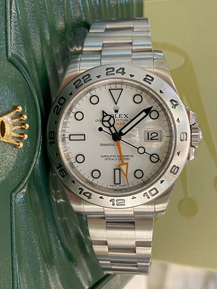 Rolex Explorer II referenza 216570 con cassa in acciaio 42mm diametro e bracciale Oyster in acciaio con fermaglio di sicurezza Oysterlock e chiusura pieghevole e maglia di prolunga rapida Easylink di 5 mm. Lunetta fissa in acciaio con la numerazione delle 24 ore. Corona di carica a vite, con sistema di doppia impermeabilizzazione Twinlock. Quadrante bianco. Visualizzazione ad alta leggibilità Chromalight con materiale luminescente blu a lunga durata. Funzioni ore minuti e secondi al centro. Visualizzazione 24 ore. Secondo fuso orario mediante regolazione rapida e indipendente dalla lancetta delle ore. Data istantanea. Arresto dei secondi per una regolazione precisa dell’ora. Autonomia circa 48 ore. Movimento meccanico a carica automatica. Vetro zaffiro antiscalfitture. Impermeabile. L’orologio è corredato scatola e garanzia originali Rolex anno 2016. L’orologio verrà spedito con portavalori a spese dell’acquirente. Rolex Explorer II reference 216570 with 42mm diameter steel case and steel Oyster bracelet with Oysterlock safety clasp and folding clasp and 5mm Easylink quick extension link. Fixed steel bezel with 24-hour numbering. Screw-down winding crown, with Twinlock double waterproofing system. White dial. Highly legible Chromalight display with long-lasting blue luminescent material. Functions hours, minutes and seconds in the center. 24-hour display. Second time zone with rapid adjustment and independent of the hour hand. Instantaneous date. Stop seconds for precise time adjustment. Autonomy approximately 48 hours. Self-winding mechanical movement. Scratch-resistant sapphire crystal. Waterproof. The watch comes with original Rolex box and guarantee year 2016. The watch will be shipped with security deposit at the buyer’s expense.
