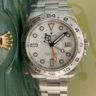 Rolex Explorer II referenza 216570 con cassa in acciaio 42mm diametro e bracciale Oyster in acciaio con fermaglio di sicurezza Oysterlock e chiusura pieghevole e maglia di prolunga rapida Easylink di 5 mm. Lunetta fissa in acciaio con la numerazione delle 24 ore. Corona di carica a vite con sistema di doppia impermeabilizzazione Twinlock. Quadrante bianco. Visualizzazione ad alta leggibilità Chromalight con materiale luminescente blu a lunga durata. Funzioni ore minuti e secondi al centro. Visualizzazione 24 ore. Secondo fuso orario mediante regolazione rapida e indipendente dalla lancetta delle ore. Data istantanea. Arresto dei secondi per una regolazione precisa dell’ora.…