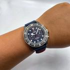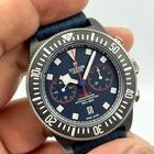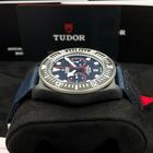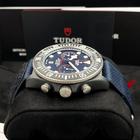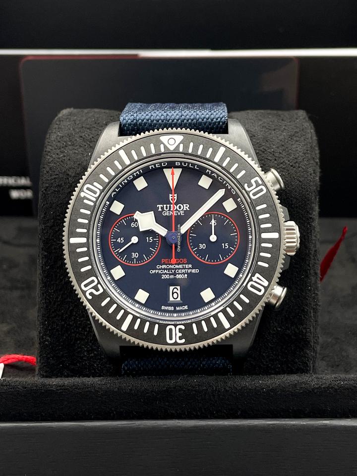 The watch is Tudor Pelagos FXD Chronograph Red Bull Alinghi The watch has a 43mm carbon composite case The watch has a black ceramic bezel The watch has a blue dial with red and white accents The watch comes with a textile strap The watch is new and unworn The watch comes with box and papers – dated March 2024