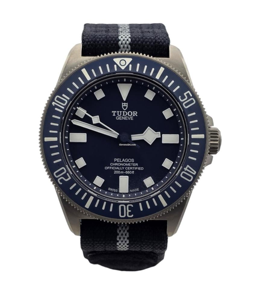 Tudor Pelagos FXD Marine Nationale Blue Dial 42MM. Ref. 25707B/22-0001 (2022) This model introduces new functional features never before used by TUDOR such as fixed strap bars which are machined as a single piece with the 42mm titanium case enhancing its overall durability and strength.
