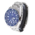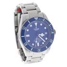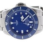 Tudor Pelagos blue 25600TB Grey titanium case with a grey titanium bracelet. Uni-directional rotating blue titanium with a ceramic top ring bezel. Blue dial with luminous silver-tone hands and index hour markers. Minute markers around the outer rim. Luminescent hands and markers. Date display at the 3 o’clock position. Tudor Calibre MT5612 automatic movement with a 70-hour power reserve. Scratch resistant sapphire crystal. Screw down crown. Solid case back. Round case shape case size: 42 mm case thickness: 14 mm. Band width: 21 mm. Deployment with push button release clasp. Water resistant at 500 meters. Functions: date hour minute second…