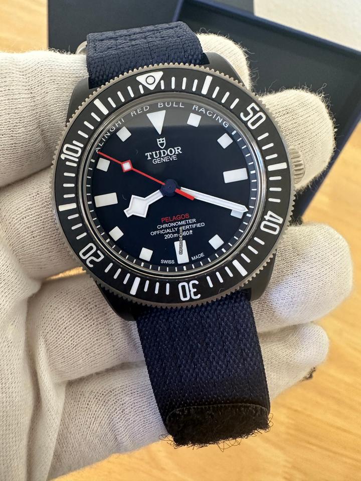 The Tudor Pelagos FXD “Alinghi Red Bull Racing Edition” (Model M25707KN-0001) is a sophisticated timepiece inspired by high-performance yacht racing. Featuring a lightweight 42mm black carbon composite case a bidirectional titanium bezel and a matte blue dial with red accents it combines durability with striking design.